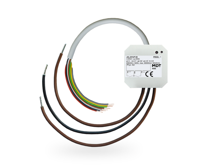 The flush-mounted version of the MDT Shutter Actuator JAL is suitable for decentralised installation on the blind or shutter motors. Existing conventional shutter push-buttons or window contacts can be connected directly to the floating binary inputs and evaluated (JAL-B1UP.02 only).