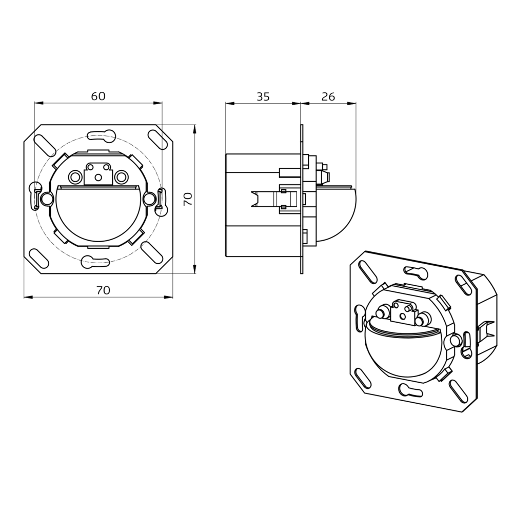 - (covering not included) 70 x 70 x 61 mm