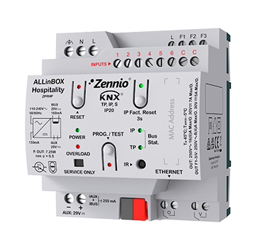 Multifunction all-in-one device that integrates a 160 mA KNX power supply, KNX-IP interface and heating/cooling module with up to 4 thermostats in just 4.5 DIN rail units. The device has 5 outputs: 4 to be used to control a 2-pipe fan coil unit, with quick fan connection using common live, and 1 16 A C-Load multipurpose relay output. It has 6 analog-digital inputs and a logic function module.