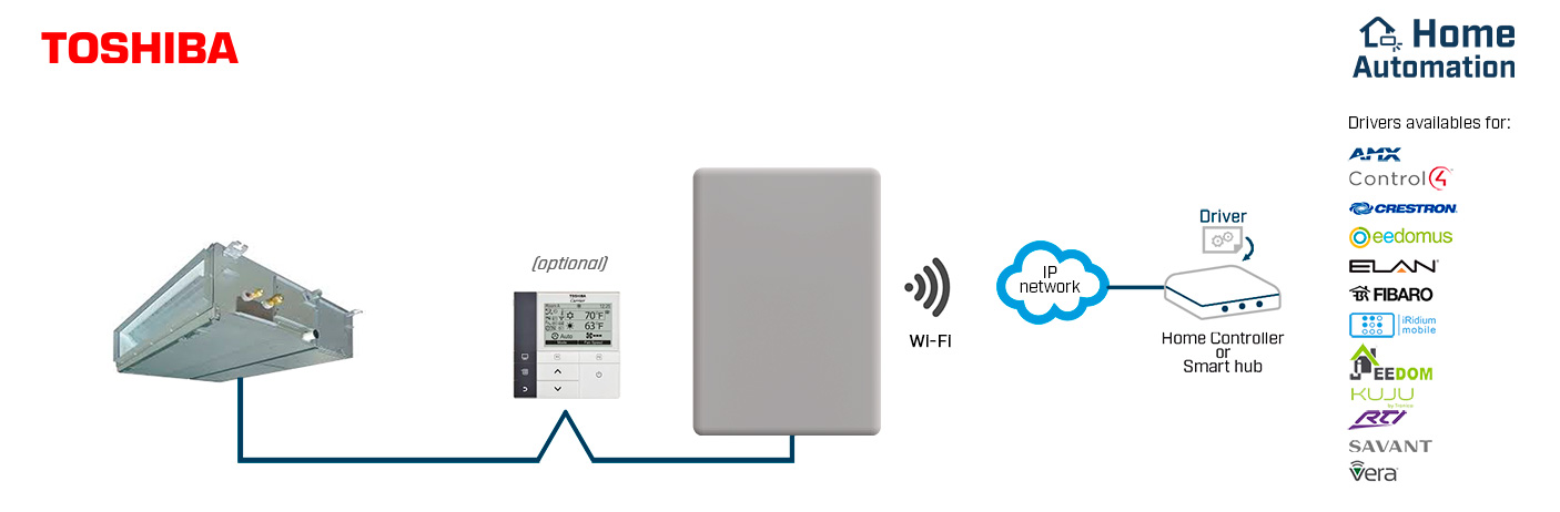 The Toshiba-ASCII gateway allows a complete and natural integration of Toshiba VRF and Digital systems into IP based Home Automation Systems. FEATURES Intuitive web interface for the WiFi configuration. b/g/n WiFi standards supported at 2,4 GHz. Quick and easy installation (plug and configure the WiFi). External power not required. Simultaneous control of the AC unit by the IR remote controller and by Home Automation systems. Integration with any IP Home Automation System thanks to our open ASCII protocol. Compatible with the drivers available in Intesis webpage.