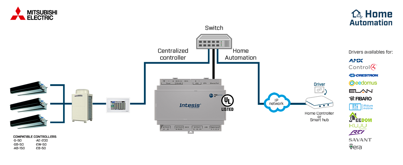 The Mitsubishi Electric-Home Automation interface allows a complete and natural integration of Mitsubishi Electric Domestic, Mr.Slim and City Multi Air Conditioner units into IP based Home Automation Systems. The solution allows the integration of up to 100 indoor units from a single interface. FEATURES UL Certified. Scan: Automatic identification of the units presents in the VRF system. Integration with any IP Home Automation System thanks to our open ASCII protocol. Compatible with the drivers available at Intesis webpage. Direct ethernet connection to the home’s local IP network. Up to 6 TCP clients (incoming sockets) are supported. Datalogging through external USB port. Configuration through IP or USB (Console) port. Front cover LED indicators to provide easy to check communication status. Automatic updates for both Intesis MAPS and interface’s firmware.