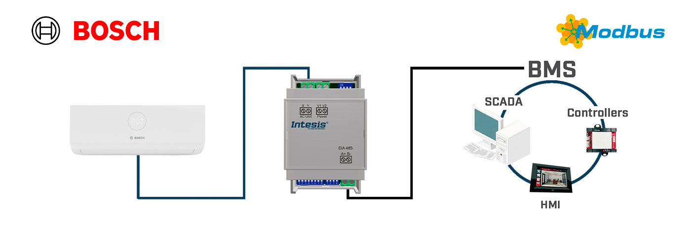 The Bosch-Modbus gateway allows fully bi-directional communication between Bosch Commercial and VRF systems and Modbus RTU (RS-485) networks. FEATURES Modbus RTU (EIA485) slave device. Configuration from both onboard DIP-switches and Modbus RTU. Quick and easy installation (plug and set the DP-SW). Simultaneous control of the AC unit by the IR remote controller and by Modbus RTU. Reduced dimensions 93 x 53 x 58 mm. Mountable on DIN rail, wall, or even inside the indoor unit in some models of AC. Window contact function allows energy savings. Costs related to HVAC systems in a building are one of the highest and these type of functions allow to reduce them. Total control and monitoring of the AC unit from Modbus RTU, including AC unit’s internal variables, running hours counter (for filter maintenance control) and error indication.