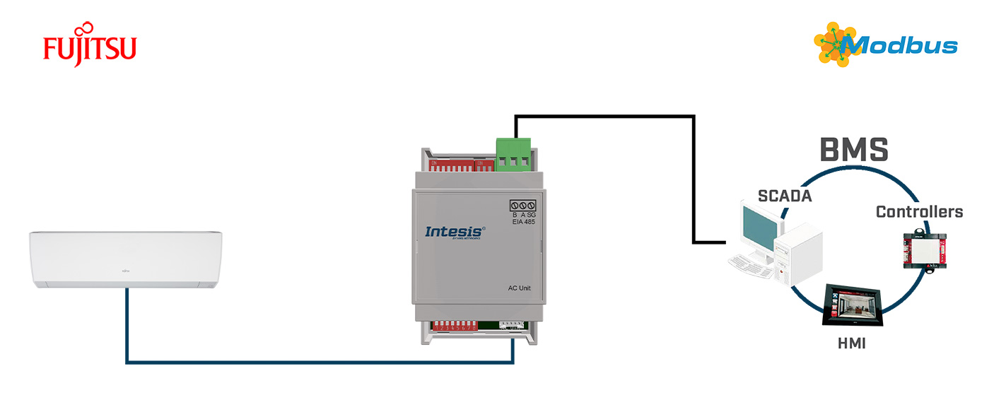 The Fujitsu-Modbus gateway allows fully bi-directional communication between Fujitsu RAC and VRF systems and Modbus RTU (RS-485) networks. FEATURES Modbus RTU (EIA485) slave device. Configuration from both onboard DIP-switches and Modbus RTU. Quick and easy installation (plug and set the DP-SW). External power not required. Simultaneous control of the AC unit by the IR remote controller and by Modbus RTU. Reduced dimensions 93 x 53 x 58 mm. Mountable on DIN rail, wall, or even inside the indoor unit in some models of AC. Window contact function allows energy savings. Costs related to HVAC systems in a building are one of the highest and this type of functions allow to reduce them. Total control and monitoring of the AC unit from Modbus RTU, including AC unit’s internal variables, running hours counter (for filter maintenance control) and error indication.