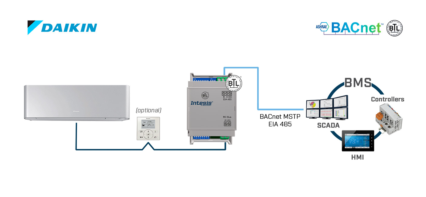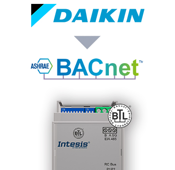 The Daikin-BACnet gateway allows fully bi-directional communication between Daikin VRV and Sky Air Conditioner units and BACnet MSTP networks. FEATURES BTL mark ensures full interoperability with BACnet devices. Support only BACnet MS/TP. Configuration from onboard DIP-switches . Quick and easy installation (plug and set the DP-SW). External power not required. Simultaneous control of the AC unit by the manufacturer’s remote controller and BACnet MS/TP. Reduced dimensions 93 x 53 x 58 mm. Mountable on DIN rail, wall, or even inside the indoor unit in some models of AC. Abstraction of Air Conditioning unit properties and functionalities as fixed BACnet Objects. Occupancy function allows energy savings. Costs related to HVAC systems in a building are one of the highest and this type of functions allow to reduce them. Total control and monitoring of the AC unit from BACnet, including AC unit’s internal variables, running hours counter (for filter maintenance control) and error indication.