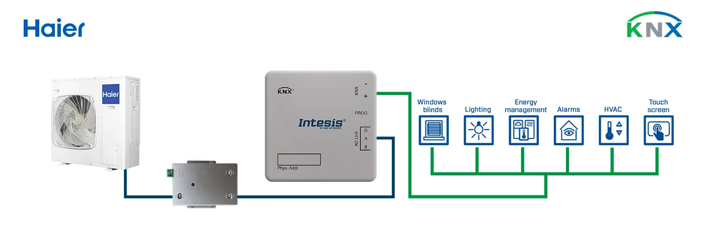 Haier Commercial & VRF systems to KNX Interface The Haier-KNX gateway allows fully bi-directional communication between Haier Commercial & VRF systems and KNX installations. FEATURES KNX certified. Configured by ETS standard configuration tool. Reduced dimensions allowing a quick installation inside the Air Conditioner unit. Offered all the required DPT objects to be compatible with all KNX thermostats in the market. Smooth integration of KNX thermostats allowing the control of the AC unit by the own temperature sensor of the thermostat. Simultaneous control of the AC unit by the IR remote controller and by KNX. Total control and monitoring of the AC unit from KNX, including AC unit’s internal variables, running hours counter (for filter maintenance control) and error indication.