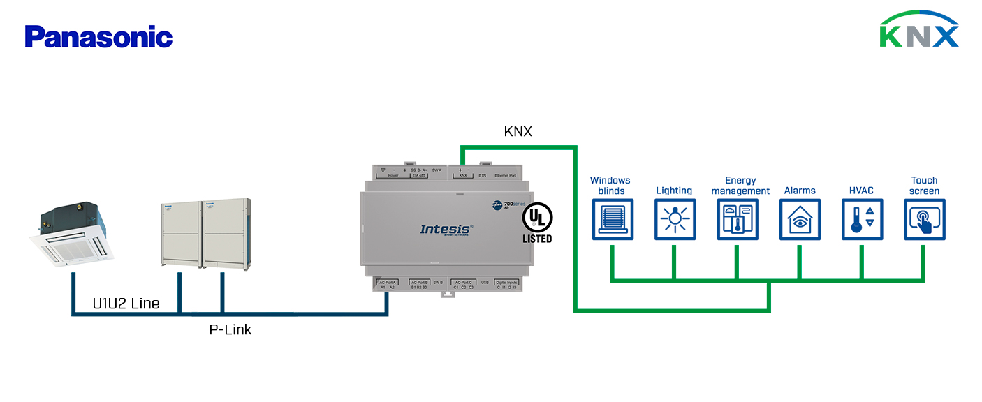 The Panasonic interface has been specially designed to allow bidirectional control and monitoring of Panasonic ECOi systems from a KNX installation. FEATURES UL Certified. Direct access to outdoor unit’s communication bus. Scan: Automatic identification of the units presents in the VRF system. Outdoor unit’s signals available for the integration. Supports KNX standard datapoints (DPTs) that guarantees a seamless integration with any KNX device or system. Wide range of monitoring & control datapoints available. Datalogging through external USB port. Configuration through IP or USB (Console) port. Front cover LED indicators to provide easy to check communication status on both the Ethernet and serial ports. Automatic updates for both Intesis MAPS and interface’s firmware.