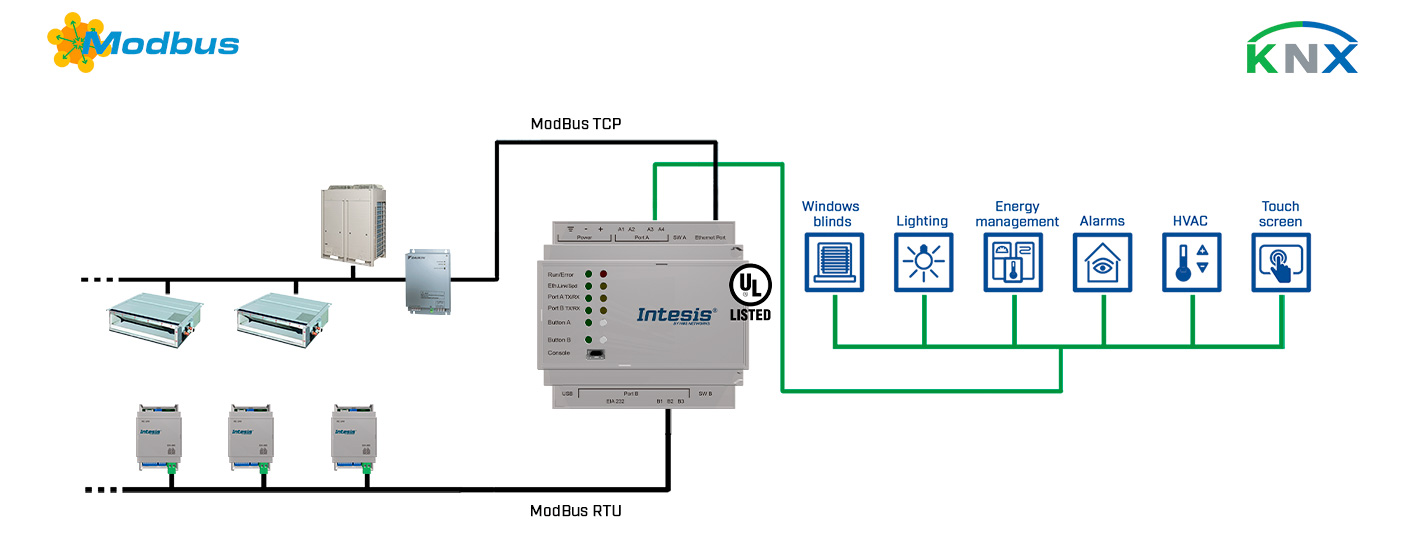 Integrate any Modbus RTU or TCP server device, or both at the same time, with any KNX device or system. The aim of this integration is to make accessible Modbus registers data and resources from a KNX system, as if it was a part of the own KNX system and vice-versa. FEATURES UL Certified Support for KNX TP Up to 3000 KNX communication objects KNX standard Datapoint Types (DPT) available Up to 5 Modbus TCP nodes/devices Up to 255 Modbus Devices per Node (RTU and TCP) Possibility to generate/download templates of your Modbus products Easy integration & updates with Intesis MAPS