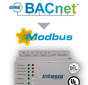 Integrate any BACnet MS/TP or BACnet IP server device, with a Modbus BMS or any Modbus TCP or Modbus RTU controller. The aim of this integration is to make accessible BACnet objects data and resources from a Modbus based control system or device, as if it was a part of the own Modbus system and vice-versa. FEATURES UL Certified BTL Certified Support for up to 5 simultaneous Modbus TCP Clients Both Modbus RTU & Modbus TCP Both BACnet IP and MS/TP supported Possibility to scan for BACnet devices with BACnet Explorer Easy integration & updates with Intesis MAPS