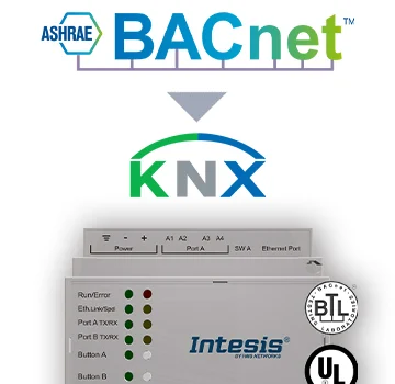 Integrate any BACnet MS/TP or BACnet IP server device, with any KNX device or system. The aim of this integration is to make accessible BACnet objects data and resources from a KNX system, as if it was a part of the own KNX system and vice-versa. FEATURES UL Certified BTL Certified Support for KNX TP Up to 3000 KNX communication objects KNX standard Datapoint Types (DPT) available Both BACnet IP and MS/TP supported Possibility to scan for BACnet devices with BACnet Explorer Easy integration & updates with Intesis MAPS