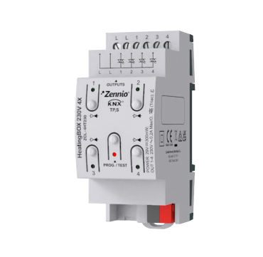 Actuator for climate systems based on water pipes which allows the control of up to 4 outputs for on/off valves operated at 230 VAC by means of triacs with short-circuit protection. It includes one independent thermostat for each output and a module with 10 logical functions. It allows manual control of the outputs with status indication through LEDs.