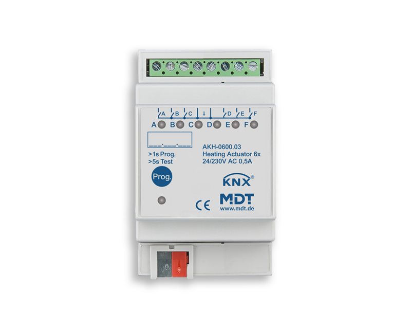 The MDT Heating Actuator AKH has an integrated PI controller for heating and cooling each channel. To control the heating, the actuator receives the room temperature, for example, from an MDT push-button or presence detector with temperature sensor; it’s not necessary to use an external temperature controller. Up to 4 x 230 V AC (3 x 24 V AC) electrothermal actuators can be connected and controlled at each of the non-wearing outputs.