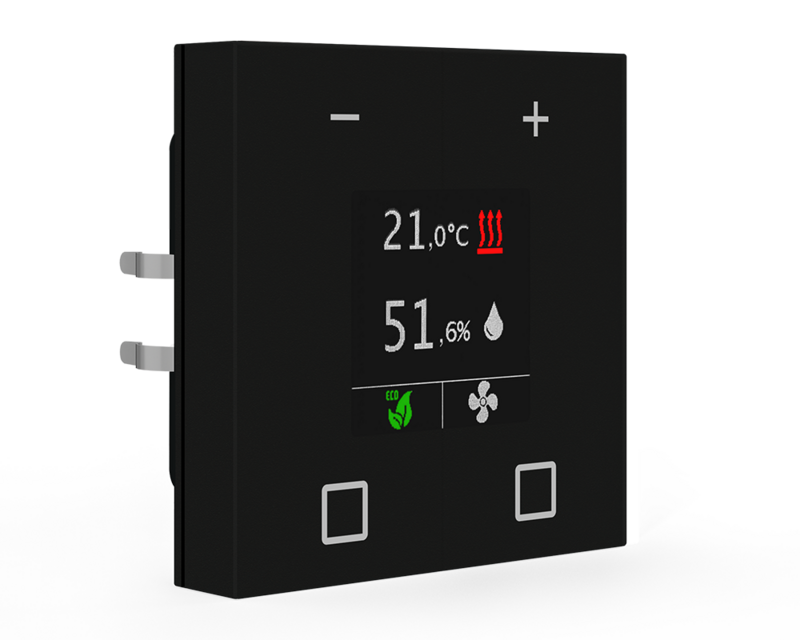The black version can be ordered now, available from Q2/24The MDT Room Temperature Controller Smart 55 with integrated temperature and humidity sensor is used for controlling the temperature of indoor rooms. Switch actuators / heating actuators can be controlled by the room temperature controller along with thermal actuators or motorised KNX actuators. In addition, the MDT Room Temperature Controller Smart has 4 binary inputs for connecting floating contacts.The MDT Room Temperature Extension Unit Smart with an integrated temperature and humidity sensor is used for recording the temperature of indoor rooms. The extension unit can be operated either as a second unit along with the MDT Room Temperature Controller Smart (integrated temperature controller!) or as a stand-alone unit with the MDT Heating Actuator AKH (integrated temperature controller!).The MDT Room Temperature Controller Smart 55 fits into the switch lines of leading manufacturers, such as:WhiteGIRA Standard 55, E2, E22, Event, EspritBERKER S1, B3, B7JUNG A 500, A PLUS, A CREATION, AS 500, A550, A FLOWMERTEN 1M, M-Smart, M-Plan, M-PureBlackGIRA E2BERKER B3, B7JUNG A550MERTEN M-Pure