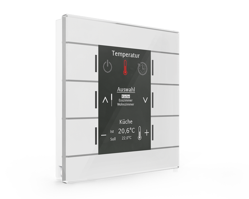 The Central Operation Unit Smart combines a large number of functions in one device and serves as a central control unit for your smart home. The integrated astronomical timer moves the blinds up in the morning automatically and down again after sunset. In addition, the outdoor lighting and the basic lighting are switched on in the house at sunset until midnight. All timer functions and switching times are individually adjustable. You can for example set the comfort temperature individually for all rooms, or activate automatic shading via the menu control. You can also lock your blinds for window cleaning or activate your KNX alarm system via the integrated code lock.Four sensor surfaces are available for selected direct operating functions. Twenty further functions can be controlled via menu and / or time switch. Overall, all functions can be operated intuitively and conveniently with the 6 sensor surfaces. The large active colour display shows indoor / outdoor temperature, temperature set points, date / time, sunrise / sunset, clear text and alarm messages are visualised. The Glass Central Operation Unit Smart is the ideal complement to the Glass Push-button II Smart. The recommended mounting height is 1.6 m.