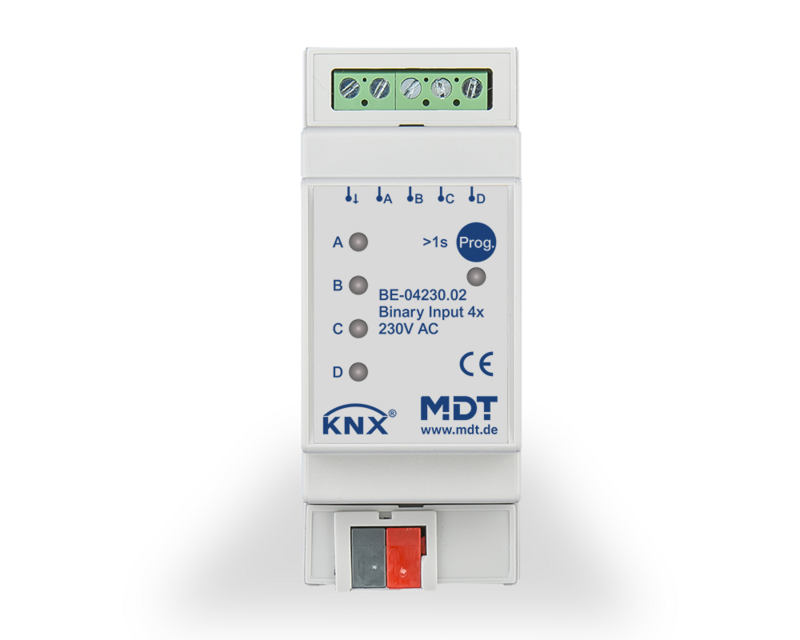 The MDT Binary Input BE, for example, makes conventional push-buttons, switches, window and auxiliary contacts “smart” for KNX. The comprehensive application provides the suitable parameters for various applications. Versions for floating contacts, 24 V AC/DC and 230 V AC are available.