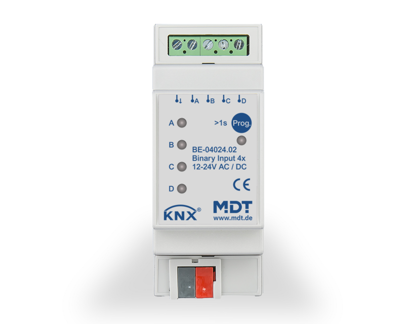 The MDT Binary Input BE, for example, makes conventional push-buttons, switches, window and auxiliary contacts “smart” for KNX. The comprehensive application provides the suitable parameters for various applications. Versions for floating contacts, 24 V AC/DC and 230 V AC are available.