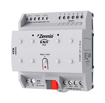 KNX Energy Monitor for electricity and water consumption, as well as heating/cooling energy consumption for up to 2 climate systems. It has 3 channels to monitor electricity consumption (max 20 A), 4 channels to connect turbine flow meters (max 15 mA at 5 VDC) and 5 analog-digital inputs to connect flow and return water temperature probes. It also includes 10 logical functions, consumption dependent notifications and alarms. The 5 VDC power output can supply power for the connected flow meters . DIN-rail mounting device (4.5 DIN-rail units).