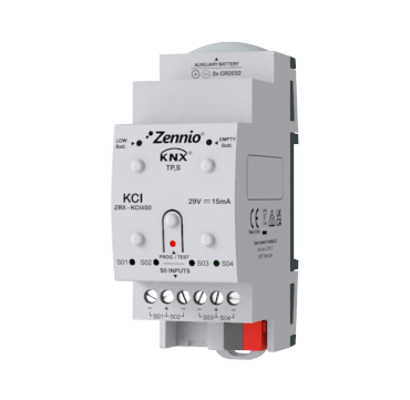 KCI (KNX Consumption Interface) is the Zennio KNX interface for four consumption meters with S0-pulse outputs to monitor their electricity (energy and power), water and/or gas (volume and flow rate) consumption measure in the KNX bus. A removable battery allows buffering S0 pulses during a KNX power failure and recovering the real consumption afterwards. LED indicators make the user able to check the existence of communication through each S0 channel, as well as the battery status (low battery and/or run out of battery), which is also indicated in the KNX bus. DIN-rail mounting device (2 DIN-rail units).