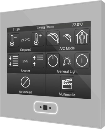 Capacitive touch panel with a backlit 3.5" display, proximity sensor, internal temperature probe and two independent thermostats. 56 control points/buttons divided over 7 pages. The built-in proximity sensor makes the screensaver (image, time and date and/or temperature) appear when the touch panel is not being used and the luminosity sensor adjusts the brightness automatically. 4 analog-digital inputs included to be configured as binary inputs, sensors, push buttons, temperature probes or motion detectors.
