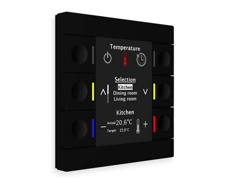 Large, active color display (automatic brightness adjustment) Four direct operating functions (e.g. present, light, blinds) 20 operating functions via menu / time switch (e.g. dimmer / shutter / switching / send values / scenes / temperature set points) Code lock with 4-6 digits, to lock and unlock the device or alarm activation Daily / weekly / astronomical time switch (20 channels each with 6 switching times) Holiday function with time period activation Automatic calculation of public holidays Comfortable room temperature controller with temp. sensor Ventilation control (manual or automatic) Visualization of inside / outside temperature, setpoint, time / date Visualization of status information / messages (1 Bit / 14 Byte) 6 status LEDs independently controllable 6 logic blocks each with 4 inputs No additional power supply required Installation in a switch box, Recommended installation height: 1.6 m Dimensions (W x H): 86 mm x 86 mm Production in Germany, certified according to ISO 9001 3 year warranty