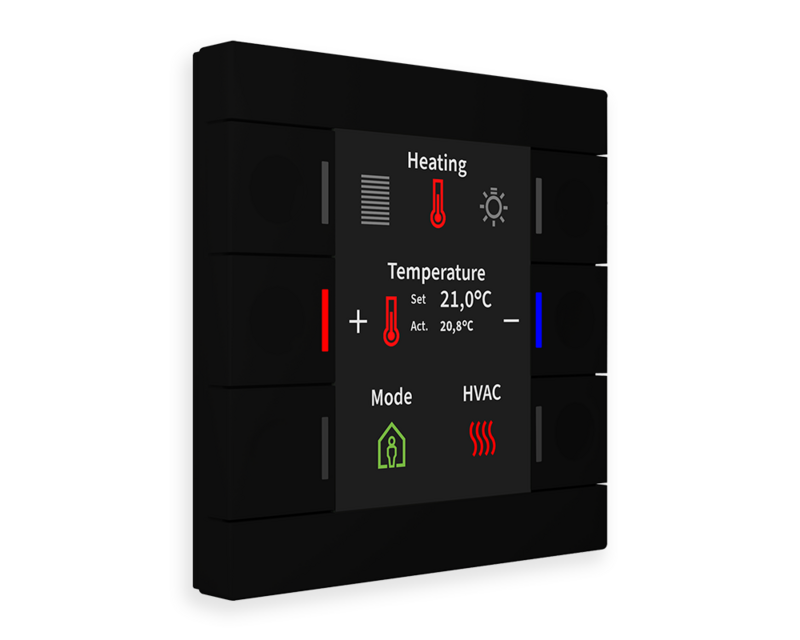 Large, colored active display to indicate function and status Adjustable background color of the disply (white or black) Symbols and plain text adjustable for each button/function 6 mechanical buttons with finger recess Up to 12 functions on 2 or 3 levels (2x6 or 3x4 functions) Up to 6 functions without level switching The buttons can be programmed for 1 or 2 button operation 1 or 2 button operation for switching, dimming, shutters, values Short / long button push with 2 objects RGB status for each button separately controllable from each level Visualization of inside / outside temperature and time Automatic display brightness via light sensor and day / night object Slap function with additional switch channel Installation without frame in an installation box Dimensions (W x H): 86 mm x 86 mm Recommended installation height: 1.10 - 1.25 m (as Push-button) No additional power supply required Integrated bus coupling unit Production in Germany, certified according to ISO 9001 3 year warranty Innovative group control with long / extra long keystroke New mapping function for easy function assignment Extended info display with up to 3 lines and up to 6 measured values Modern new icons Patch function with extended range of functions