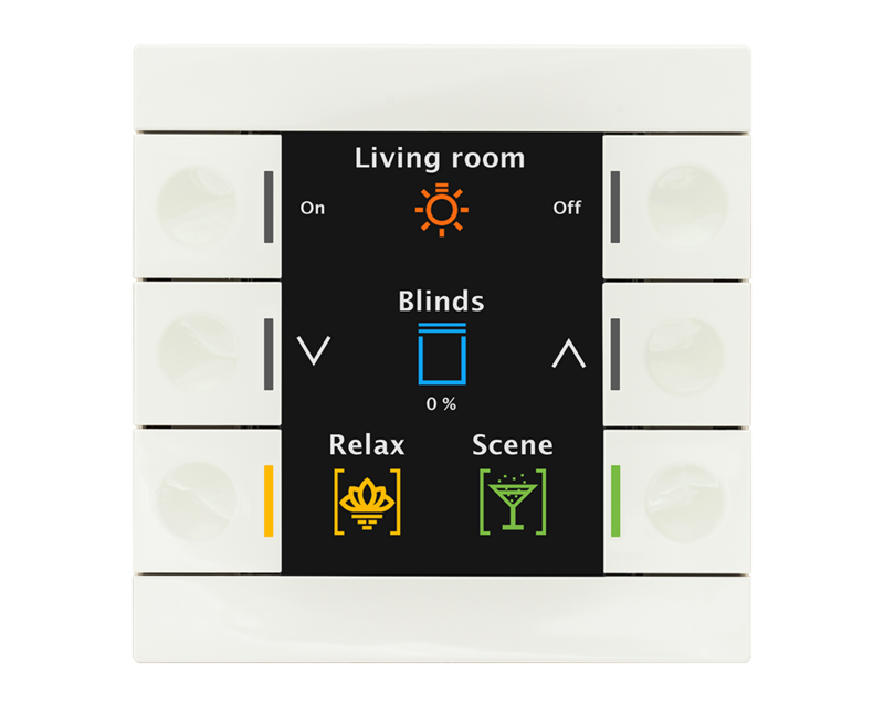 Large, colored active display to indicate function and status Adjustable background color of the disply (white or black) Symbols and plain text adjustable for each button/function 6 mechanical buttons with finger recess Up to 12 functions on 2 or 3 levels (2x6 or 3x4 functions) Up to 6 functions without level switching The buttons can be programmed for 1 or 2 button operation 1 or 2 button operation for switching, dimming, shutters, values Short / long button push with 2 objects RGB status for each button separately controllable from each level Visualization of inside / outside temperature and time Automatic display brightness via light sensor and day / night object Slap function with additional switch channel Installation without frame in an installation box Dimensions (W x H): 86 mm x 86 mm Recommended installation height: 1.10 - 1.25 m (as Push-button) No additional power supply required Integrated bus coupling unit Production in Germany, certified according to ISO 9001 3 year warranty Innovative group control with long / extra long keystroke New mapping function for easy function assignment Extended info display with up to 3 lines and up to 6 measured values Modern new icons Patch function with extended range of functions