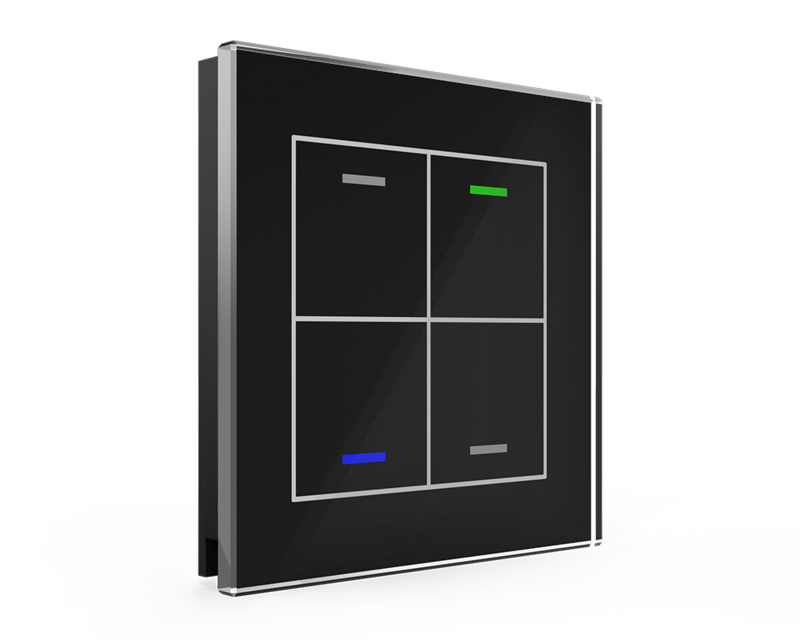 Comprehensive application New multi-touch function, sends up to 4 values / DPTs on the same or different objects Innovative group control with long / extra long button press 1 and 2 button operation for switching, dimming, shutters, values Changing of values / scenes with up to 4 values Operation with short / long button push and 2 objects Slap function with additional switch channel Two RGBW status LEDs per button pair LED brightness controllable via day / night or brightness object 4 logic blocks Installation in an installation box Dimensions (W x H): 92 mm x 92 mm Integrated bus coupling unit Production in Germany, certified according to ISO 9001 3 year warranty