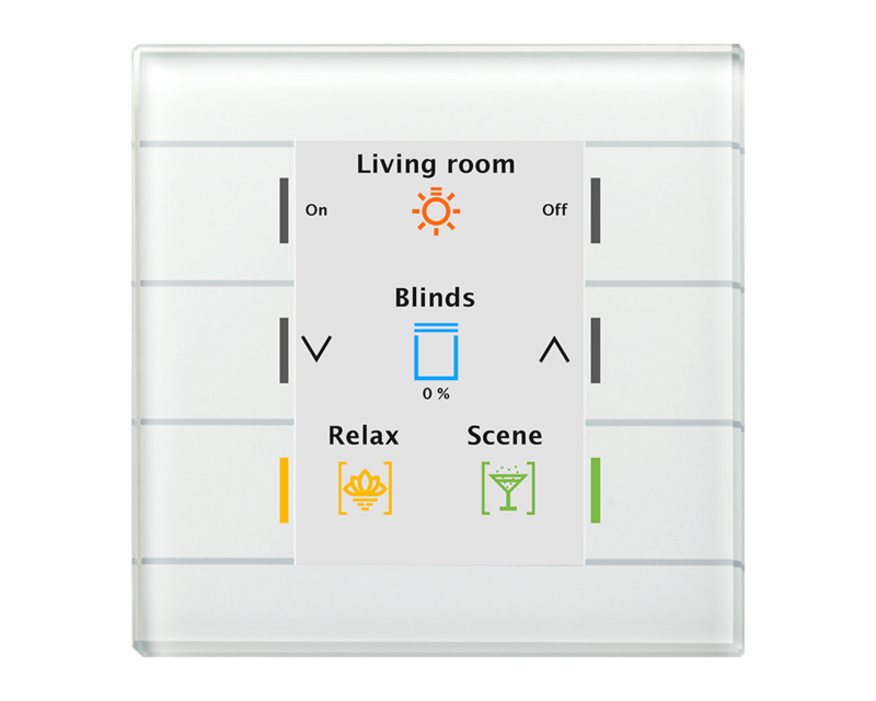 New: black Glass products, now complemented with a black base plate The buttons can be programmed for 1 or 2 button operation Up to 12 functions on 2 or 3 levels (2x6 or 3x4 functions) Up to 6 functions without level switching Innovative group control with long/extra long operation / Keystroke New mapping function for convenient function allocation Large, active colour display to indicate function and status Adjustable background colour of the display (white or black) New Standard symbols Symbols and plain text adjustable for each button / function Indication of individual messages / text telegrams (1 Bit / 14 Byte) Application as RTC in combination with AKH heating actuator 1 or 2 button operation for switching, dimming, shutters, values Short / long button push with 2 objects Innovative group control with long/extra long operation / Keystroke New mapping function for convenient function allocation Extended info display with up to 3 lines and up to 6 measured values Modern Icons (Icon upload) Slap function with new range of functions RGB status of all buttons separately controllable from each level Indication of indoor / outdoor temperature and time Automatic display brightness via light sensor and day / night object Slap function with new range of functions Recommended installation height: 1.50-1.60 m (as Push Button) Installation in an installation box Dimensions (W x H): 92 mm x 92 mm No additional power supply required With temperature sensor for room temperature measurement Additional functions to set temperature and operating mode Application as RTC in combination with AK heating actuator