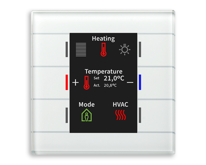 New: black Glass products, now complemented with a black base plate The buttons can be programmed for 1 or 2 button operation Up to 12 functions on 2 or 3 levels (2x6 or 3x4 functions) Up to 6 functions without level switching Innovative group control with long/extra long operation / Keystroke New mapping function for convenient function allocation Large, active colour display to indicate function and status Adjustable background colour of the display (white or black) New Standard symbols Symbols and plain text adjustable for each button / function Indication of individual messages / text telegrams (1 Bit / 14 Byte) Application as RTC in combination with AKH heating actuator 1 or 2 button operation for switching, dimming, shutters, values Short / long button push with 2 objects Innovative group control with long/extra long operation / Keystroke New mapping function for convenient function allocation Extended info display with up to 3 lines and up to 6 measured values Modern Icons (Icon upload) Slap function with new range of functions RGB status of all buttons separately controllable from each level Indication of indoor / outdoor temperature and time Automatic display brightness via light sensor and day / night object Slap function with new range of functions Recommended installation height: 1.50-1.60 m (as Push Button) Installation in an installation box Dimensions (W x H): 92 mm x 92 mm No additional power supply required With temperature sensor for room temperature measurement Additional functions to set temperature and operating mode Application as RTC in combination with AK heating actuator