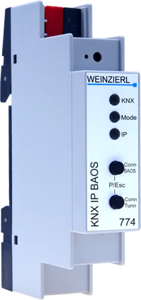 TheKNX IP BAOS 774is used asInterfacefor connecting to KNX both on telegram level (KNXnet/IP Tunneling) and on data point level (KNX Application Layer). Clients can directly access Group Objects via either a Binary Protocol (over TCP/IP or UDP/IP) or via JSON (Java Script Object Notation) Web Services. The device is configured with the ETS and supports up to1000 Group Objects. 10 simultaneous client connections are supported.BAOS is an acronym for “Bus Access and Object Server”. It is possible to connect to the KNX bus everywhere over LAN. Bus connection over the internet with KNX IP BAOS 774 is also possible. The device supports 5 simultaneous KNXnet/IP tunneling connections.The buttons are for diagnostic purposes. The LEDs indicate the operating status and communication errors on the bus. Power is supplied via the KNX bus.BAOS SDKFor quick and easy integration of BAOS services in your own projects there are two free SDKs available. First, the BAOS Binary SDK, a C++ implementation of the BAOS Binary Protocol. The following systems are supported:WindowsLinuxMac OS XiOSFor the integration of BAOS Services in a Web browser, we offer the BAOS Web Services SDK. This SDK is based on HTTP and Java script, the BAOS Services provides a simple JavaScript API.