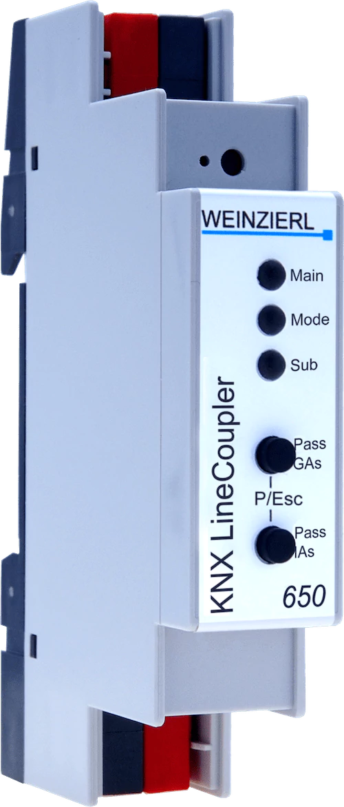 TheKNX LineCoupler 650connects two KNX segments (for example, a KNX line with a KNX area). It has a very compact design. The device has a filter table (8K bytes) and ensures a galvanic isolation between the lines. The coupler is compatible with the ETS® software from ETS4.2. The buttons on the front panel allow disabling the telegram filter for testing purposes. The LEDs indicate the operating status and communication errors on the bus.