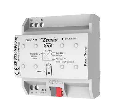 KNX System Power Supply with additional 29VDC output. Maximum current 320mA (KNX bus plus additional output consumption). Reset button and overload status LED, shortcircuit and overload protection. 230V~ 50/60Hz input voltage. Size: 80 x 90 x 60 mm (4.5 DIN rail units).