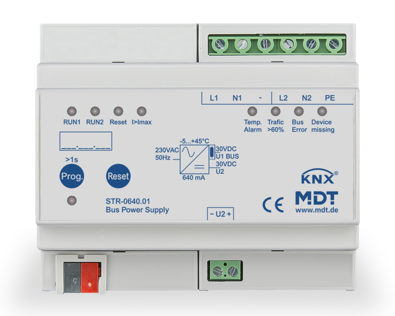 The MDT KNX Power Supply with integrated choke supplies the KNX Bus with a constant, stabilized 30 V DC voltage. The redundant Bus Power Supply has two integrated power supplies to increase operation reliability. If one mains voltage or one of the internal power supplies fails, the KNX bus voltage maintains its stability by the second power supply. The integrated bus coupling unit with diagnostic function monitors the bus voltage, bus current, bus overload and bus voltage failure / return. All events are stored with time stamp in the internal ring buffer. The ring buffer can be read out by a 14 Byte telegram.
