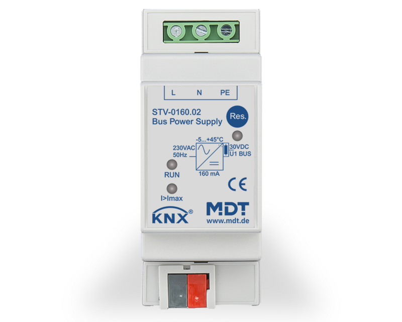 The MDT KNX / EIB Power Supply with integrated choke produces the stabilized KNX system voltage (30 V DC) to supply the connected KNX / EIB components. The operating status is indicated via 3 LED.