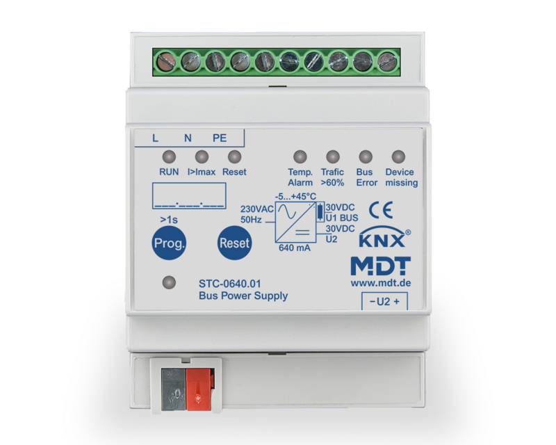 The MDT KNX Power Supply with integrated choke supplies the KNX Bus with a constant, stabilized 30 V DC voltage. The integrated bus coupling unit with diagnostic function monitors the bus voltage, bus current, bus overload and bus voltage failure / return. All events are stored with time stamp in the internal ring buffer. The current operating status is indicated via 8 colored LED on top of the device:
