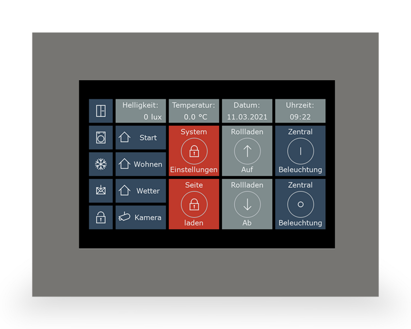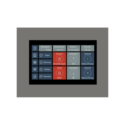 Capacitive glass touch display with LED backlight User interface individually programmable Switching and dimming, shutter / blind control Remote access via iPad / iPhone / Android / PC Alarm indication Displaying trends Forwarding of informations via email VisuControl lite software and demo projects included LED backlight 24 V DC power supply required (e.g. STV-0024-01) Integrated bus coupling unit Production certified according to ISO 9001 3 year warranty Glass cover frame white 247 x 190 mm Glass cover frame black 247 x 190 mm Cover frame brushed stainless steel look 244 x 198 mm Flush mounted metal installation box 213 x 171 x 84 mm Glass cover frame white 318 x 237 mm Glass cover frame black 318 x 237 mm Cover frame brushed stainless steel look 314 x 233 mm Flush mounted metal installation box 275 x 189 x 76 mm