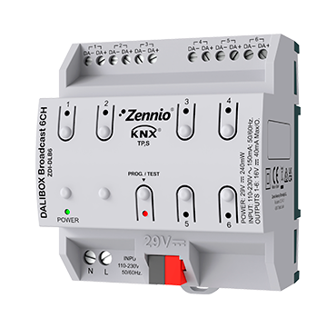 KNX-DALI Broadcast interface for DIN-rail (4.5 units) to control up to 6 channels of up to 20 DALI ballasts with broadcast commands and with up to 10 configurable scenes/sequences for each channel. It allows manual control and status indicator LEDs for each channel.