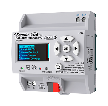 KNX-DALI Interface for DIN-rail (4.5 units) to control up to 64 DALI independent ballasts, which can be associated in up to 64 groups. It includes a display and ETS DCA for easily addressing when a ballast is replaced, that also helps assigning ballasts to groups. Error indicators for each ballast.
