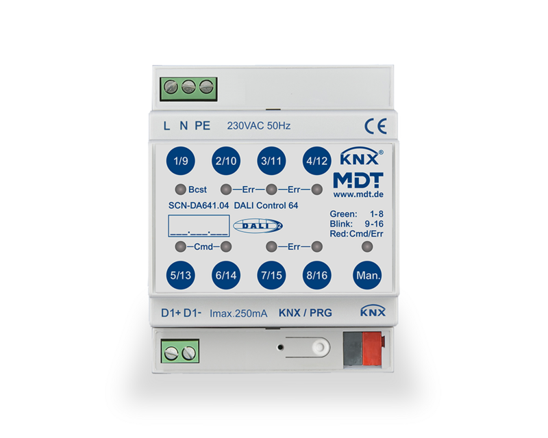 SCN-DA641.04: Individual control of up to 64 ECGs / 16 DALI groups SCN-DA642.04: 2 DALI outputs for max. 2 x 64 ECGs; individual control of up to 64 ECGs / 16 DALI groups per output Supports DALI and DALI-2 standard, as well as DALI ECG DT6 / DT8 Innovative HSV color control, RGB, RGBW and XY colour according to DALI DT8 standard (16 DALI groups) Tunable White, color temperature control (16 DALI groups) Integrated color control module for time-dependent control of the luminous color in up to 300 steps Operation modes incl. normal operation, continuous operation, night operation, stairwell- and panic operation, manual operation 16 scenes with individual dimming times Energy saving function for switching off the ECGs in the DALI groups (via additional KNX switch actuator) Fault detection of lamp faults and faulty ECGs Quick exchange of ECG Free DCA app for commissioning the DALI bus system and configuration of the scenes and time control Commissioning with ETS5 or higher Production in Germany certified according to ISO 9001 3 years warranty