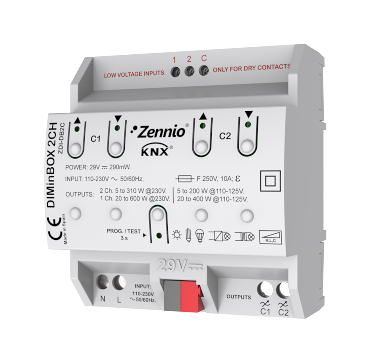 Universal DIMMING actuator (RLC, LED, CFL): 2 channels for up to 310W or 1 channel for up to 600W @ 230VAC (2 channels for up to 200W or 1 channel for up to 400W @ 110-125VAC). Auto load type detection (RLC). Configurable dimming curves for LED and CFL. It allows manual control of its outputs thanks to the push buttons on the cover. It includes 10 independent logical functions. In addition, it incorporates 2 analog-digital inputs that may be configured as binary inputs for sensors and potential-free push buttons, as temperature probe inputs or as motion sensor inputs. Error detection: short circuit, voltage surge, overheating, anomalous frequency, supply voltage failure, open circuit, parameterization error.