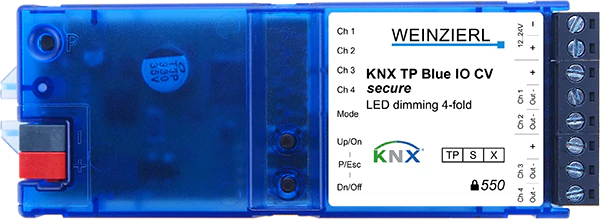 TheKNX TP Blue IO 550 CVsecureis a compact RGB / RGBW / Tunable Whitedimming actuatorwith 4 PWM outputs.Thedimming actuatorcan be used e.g. for LED panels or stripes with RGB / RGBW / Tunable White configuration or as4 independent dimmer channels. Every configuration allows controlling the channel by switching, rel. dimming and dimming value.Several comfort functions are integrated as well, including scenes, slumber fading, staircase light and sequencer.Two push buttons and five LEDs allow a local operation and a visualization of the device state.In addition to the output channels the device includes 16 independent functions for logic or timer control.The device supportsKNX Data Security.