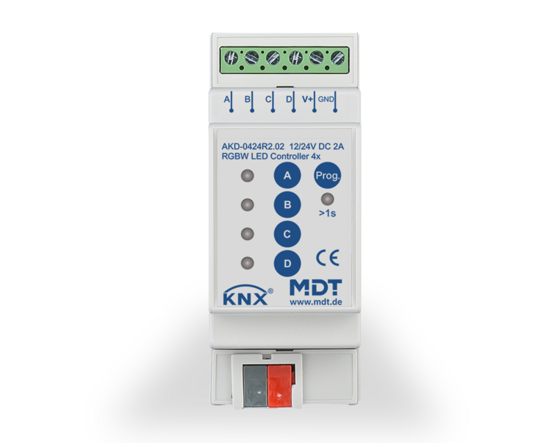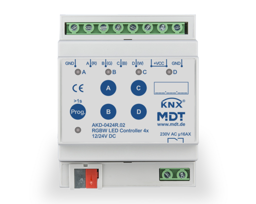 Comprehensive function extension Absolute and relative dimming for HSV color space and RGBW Tunable White color temperature control Selectable dimming curve and PWM frequency up to 1000 Hz Global and individual dimming speeds Individual and predefined sequences (e.g. TV Simulator) Repetition of sequences for automatic color control Suitable for 12 / 24 V CV LED (Common Anode), 4 A for each color channel Selectable load distribution: AKD-0424R2.02: 4 channels each 2 A or 1 ch. 3.5 A and 3 ch. 1.5 A AKD-0424R.02: 4 channels each 4 A or 1 ch. 7.0 A and 3 ch. 3.0 A Parallel operation of 2 channels Operating modes: 4 x White, RGB, RGBW, Tunable White Automatic color temperature control Dim2Warm Dynamic daylight control HCL (Human Centric Lighting) Automatic time-dependent dimming Day / night function Overcurrent and overtemperature monitoring Intelligent 16 A C-Load Relay output to control external LED power supply (not AKD-0424R2.02) Production in Germany certified according to ISO 9001 3 year warranty