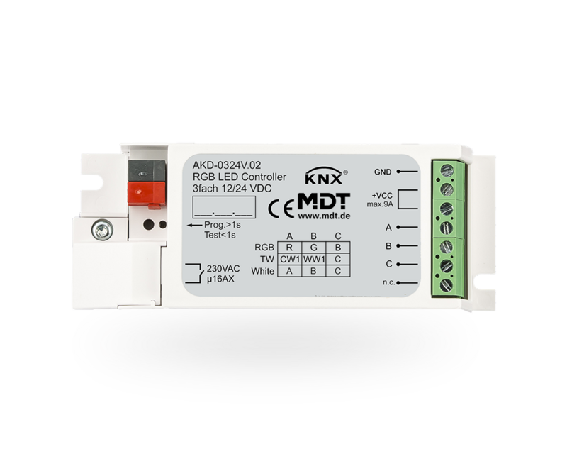 Comprehensive function extension Absolute and relative dimming Tunable White color temperature control Selectable dimming curve and PWM frequency up to 1000 Hz Global and individual dimming speeds Individual and predefined sequences (e.g. TV Simulator) Repetition of sequences for automatic color control Suitable for 12 / 24 V CV LED (Common Anode), 3 A for each color channel Selectable load distribution: AKD-0224V.02: 2 channels each 3 A AKD-0324V.02: 3 channels each 3 A or 1 ch. 4,50 A and 2 ch. 2,25 A AKD-0424V.02: 4 channels each 3 A or 1 ch. 5,25 A and 3 ch. 2,25 A Parallel operation of 2 channels Operating modes: 4 x White, RGB, RGBW, Tunable White Automatic color temperature control Dim2Warm Dynamic daylight control HCL (Human Centric Lighting) Automatic time-dependent dimming Day / night function Overcurrent and overtemperature monitoring Intelligent 16 A C-load relay output to control external LED power supply Production in Germany certified according to ISO 9001 3 year warranty
