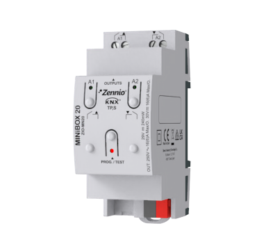 Multifunction actuator for DIN-rail (2 units) with 2 outputs (16 A C-load) which offer multiple configurations as shutter channelsor individual outputs. It allows manual control of its outputs through the push buttons on the cover and includes a logical function module.