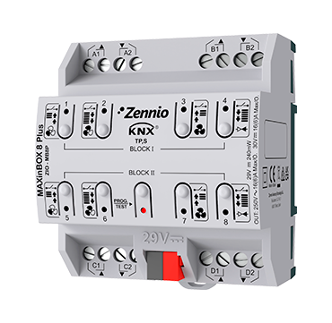 MAXinBOX 8 Plus is a multifunction actuator for DIN rails that offers multiple configurations of up to 4 shutter channels, up to 8 independent outputs of 16A (capacitive loads supported) and up to 2 blocks of 2-pipes fan coil controller. It allows manual control of its outputs thanks to the push buttons on the cover. It includes 20 independent logical functions. 4.5 DIN rail units.