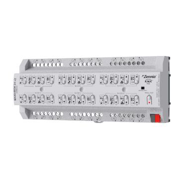 Multifunction actuator for DIN-rail (12 units) that offers multiple configurations of up to 12 shutter channels, up to 24 independent outputs of 16 A (capacitive loads supported) and up to 6 blocks of 2-pipes fan coil controller. It allows manual control of its outputs thanks to the push buttons on the cover. LED indicators can show the status of its outputs. It includes 30 independent logical functions to enlarge the versatility of the automations in KNX system. Accessories: AC/DC shutter adapters.