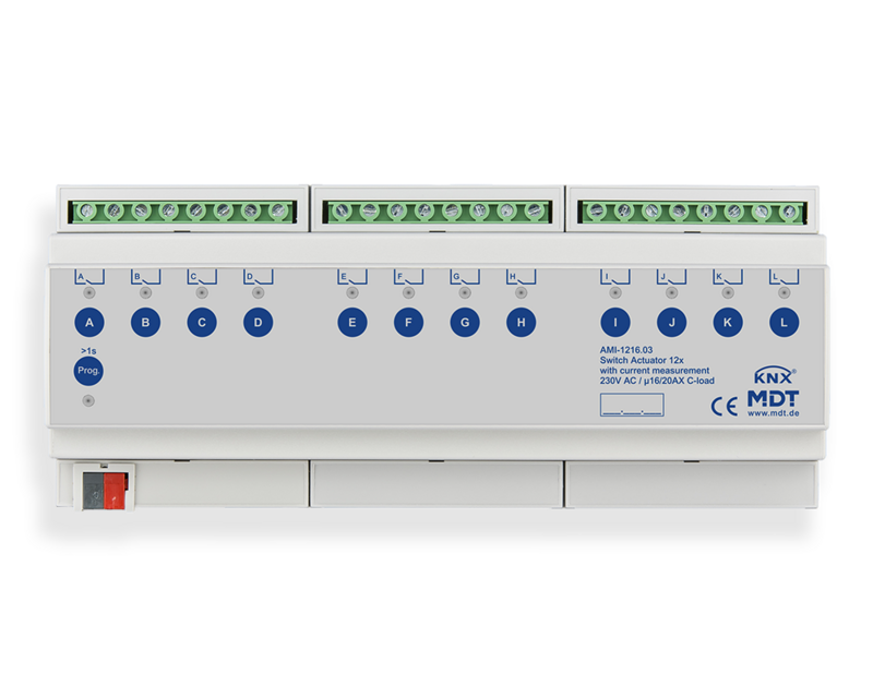 The industrial version of the MDT Switch Actuator AMI with current measurement reliably measures currents with up to 20 amperes per channel. This makes it possible, for example, to monitor load overshoot and load undershoot. High inrush currents and C-loads of up to 200 µF are no problem for the AMI.