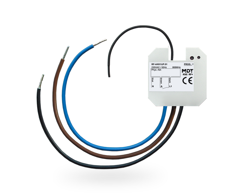 KNX RF+ protocol in system mode Commissioning with ETS 5 or higher For operation inside the EU, 868 MHz NO and NC contact operation Time functions (switch-on / switch-off delay, staircase light function) Status response (active / passive) for each channel Logical linking of binary data 8 scenes per channel Central switching functions and block functions Flush mounted in an installation box Connection via MDT KNX RF+ Line Coupler To upgrade your installation without installing KNX bus cables Power supply 230 V AC Dimensions (W x H x D): 41 mm x 41 mm x 22 mm Integrated bus coupling unit Production in Germany, certified according to ISO 9001 3 year warranty