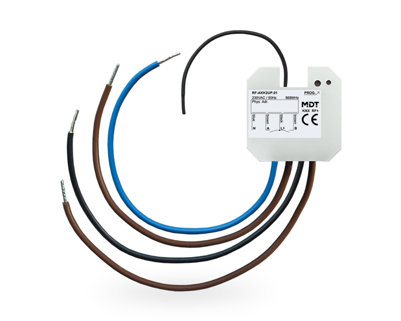 KNX RF+ protocol in system mode Commissioning with ETS 5 or higher For operation inside the EU, 868 MHz NO and NC contact operation Time functions (switch-on / switch-off delay, staircase light function) Status response (active / passive) for each channel Logical linking of binary data 8 scenes per channel Central switching functions and block functions Flush mounted in an installation box Connection via MDT KNX RF+ Line Coupler To upgrade your installation without installing KNX bus cables Power supply 230 V AC Dimensions (W x H x D): 41 mm x 41 mm x 22 mm Integrated bus coupling unit Production in Germany, certified according to ISO 9001 3 year warranty