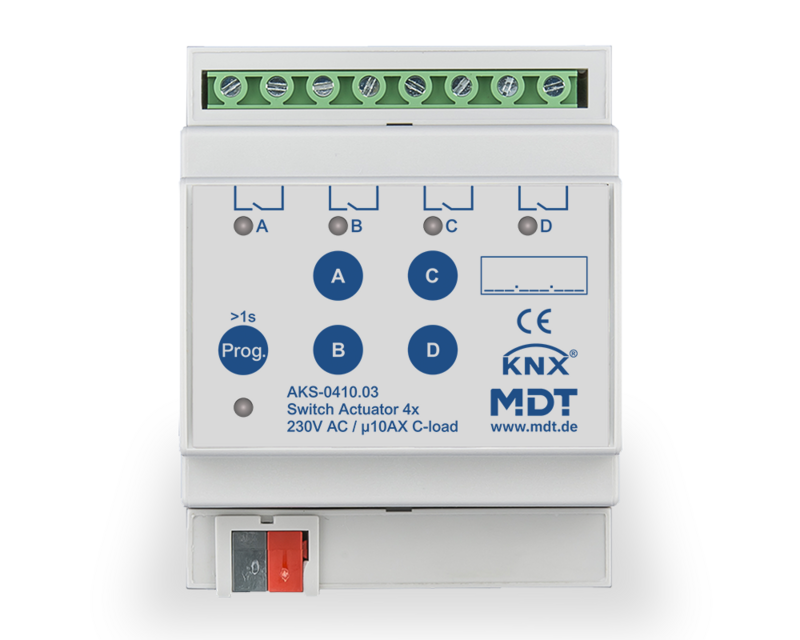 The standard version of the MDT Switch Actuator AKS 10 A comes with a large range of functions for small loads and offers more channels with a smaller space requirement. This saves costs per channel and for the sub-distribution. The actuator is equipped with bistable relays for currents up to 10 A and high C-loads of up to 140 µF. Each channel can be switched directly on the actuator via a button.
