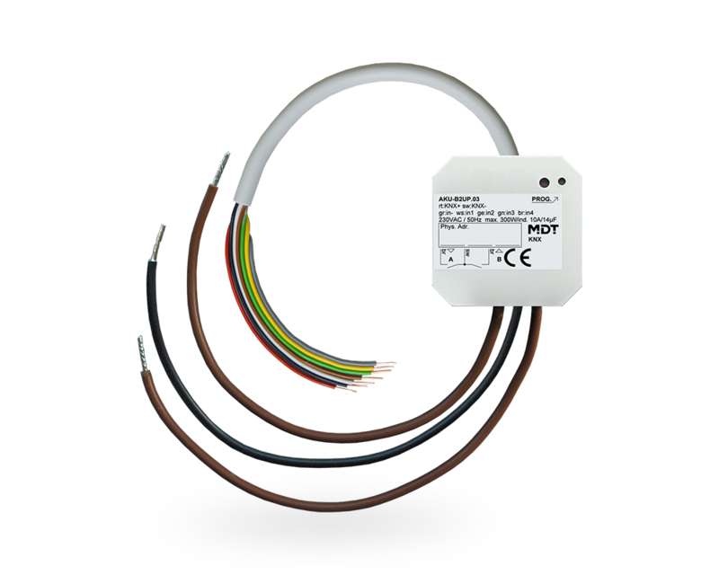 The flush-mounted version of the new Universal Actuator AKU can be used in a variety of ways: As a switch actuator with various functions (2-fold), as a shutter actuator (1-fold) with automatic shading function or as a heating actuator. The versatile application offers full functionality in all three areas. Existing conventional shutter push-buttons or window contacts can be connected directly to the floating binary inputs and evaluated (AKU-B2UP.03 only).